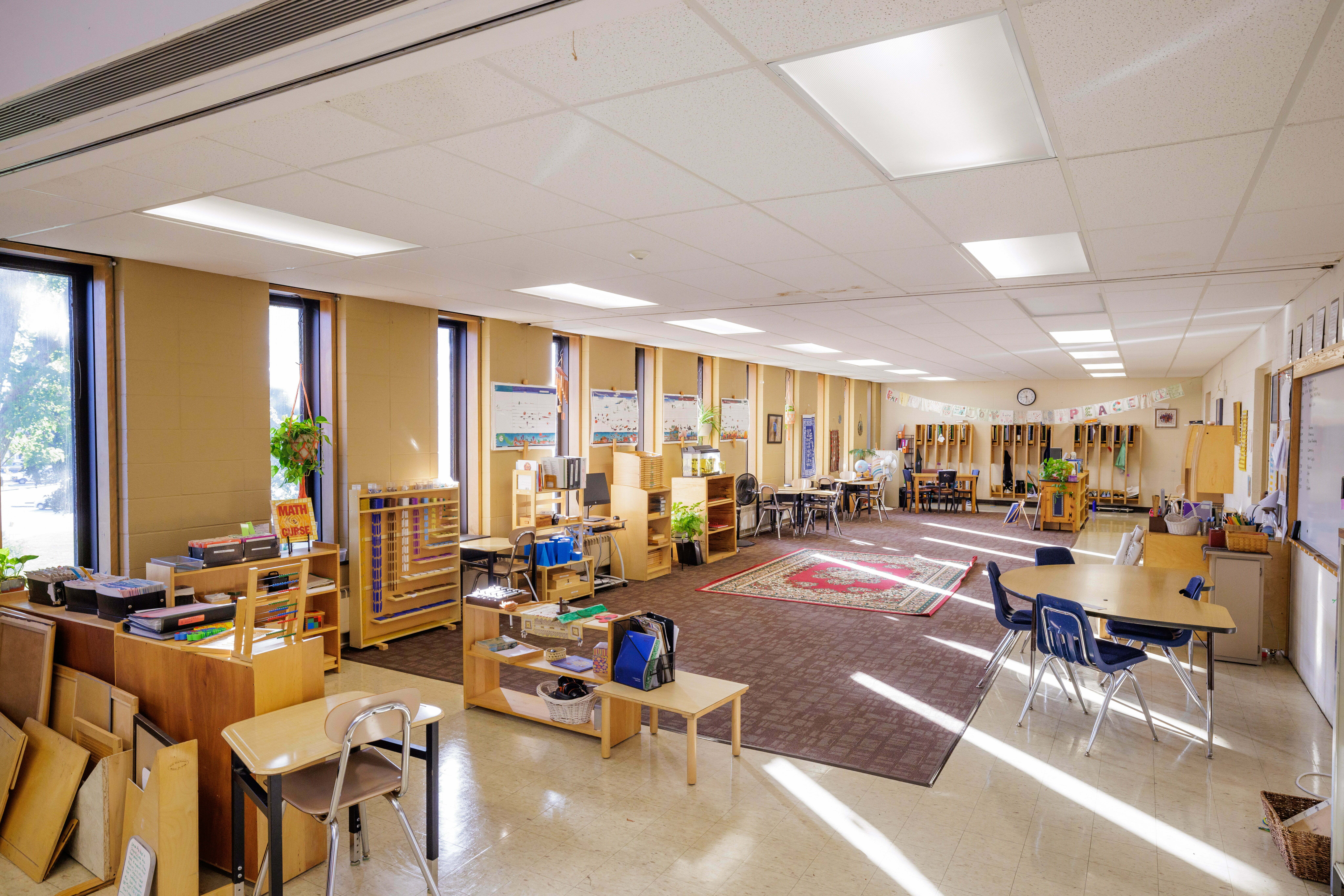 Each learning environment is beautiful, simple, well-ordered, and designed to maximize freedom and independent learning. Learning materials and other tools are arranged in inviting and accessible ways depending on the developmental plane of the student. Children can freely retrieve materials, work with them, and replace them on the shelves at their own pace and according to their own interests. Montessori guides ensure that learning environments are carefully prepared and maintained to best serve each child.