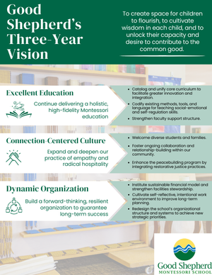 Good Shepherd Montessori School has a big vision: to create space for children to flourish, to cultivate wisdom in each child, and to unlock their capacity and desire to contribute to the common good.
