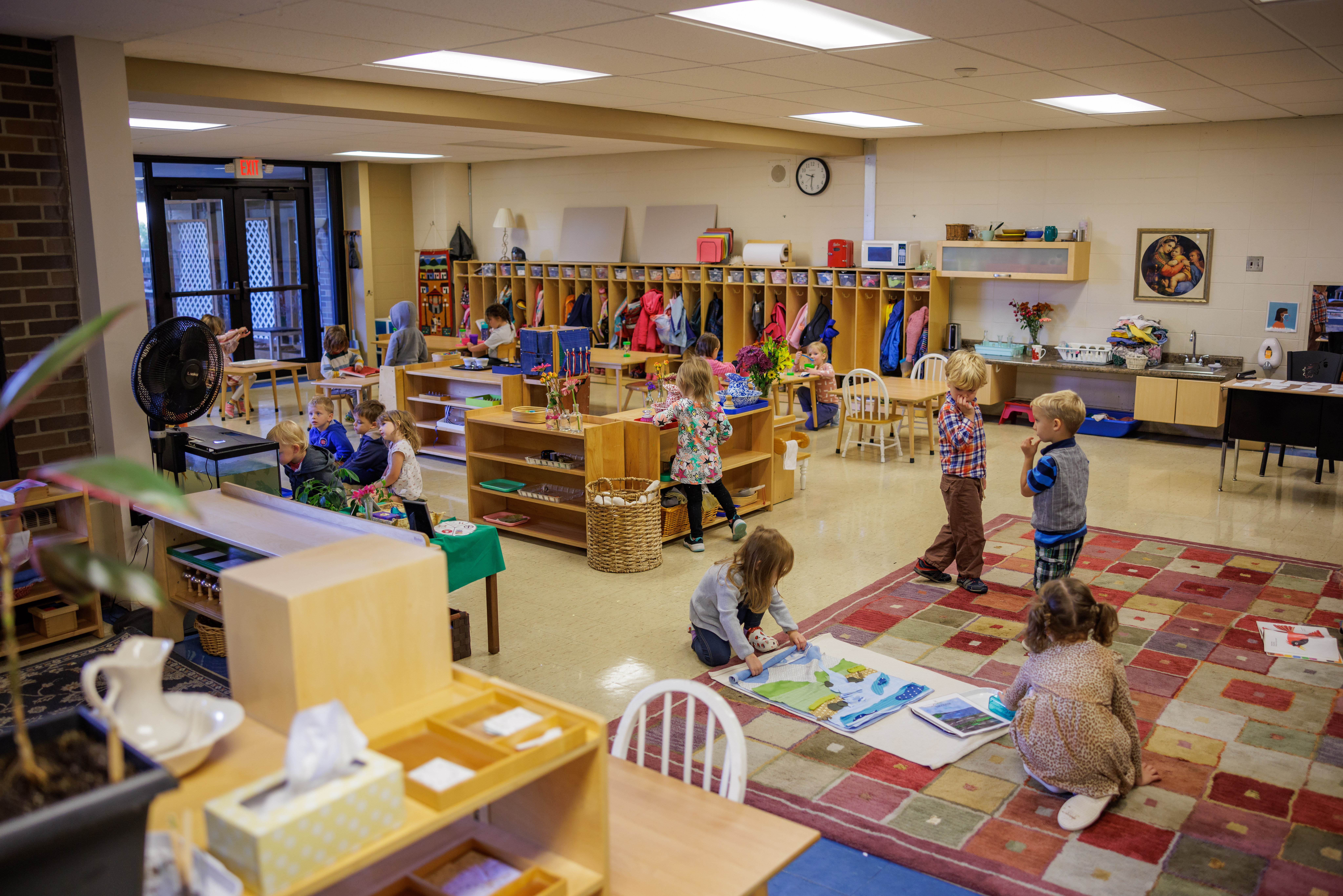 A hallmark of Montessori education is the freedom to move around in the classroom. Children are not stuck at a desk all day, but have many opportunities to stretch their legs and take part in an optional yoga activity in the hall. Students also enjoy a daily recess after lunch and a weekly “physical expression” time where they play different games, usually outdoors.